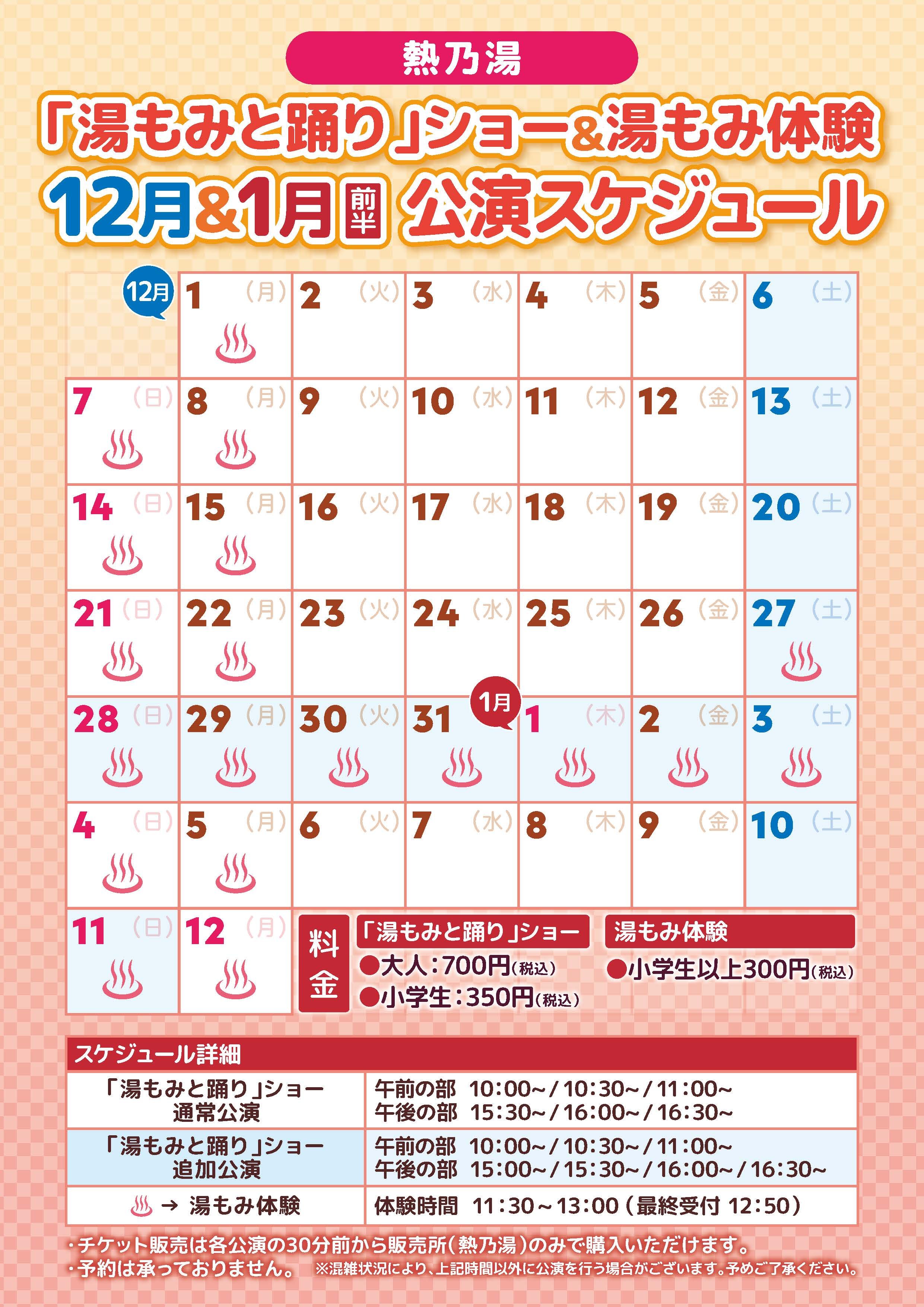 熱乃湯「湯もみと踊り」ショー&湯もみ体験 12月&1月前半 公演スケジュール